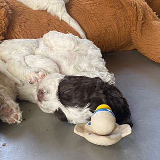 Alt legetøj er populært. Både gavepapir, afbidte bamseben, reb, grankogler, bolde, tomme plasticflasker, spande og ja selvfølgelig kødben. De leger med dem alene eller sammen og prøver at stjæle fra hinanden.