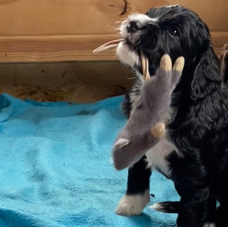 Og hvalpene elsker bare hestebamsen. Man kan slås på den, lægge sig øverst og føle sig større end alle andre og det bedste sted at sove er puttet ind mellem benene, som om man lå hos sin mor...
